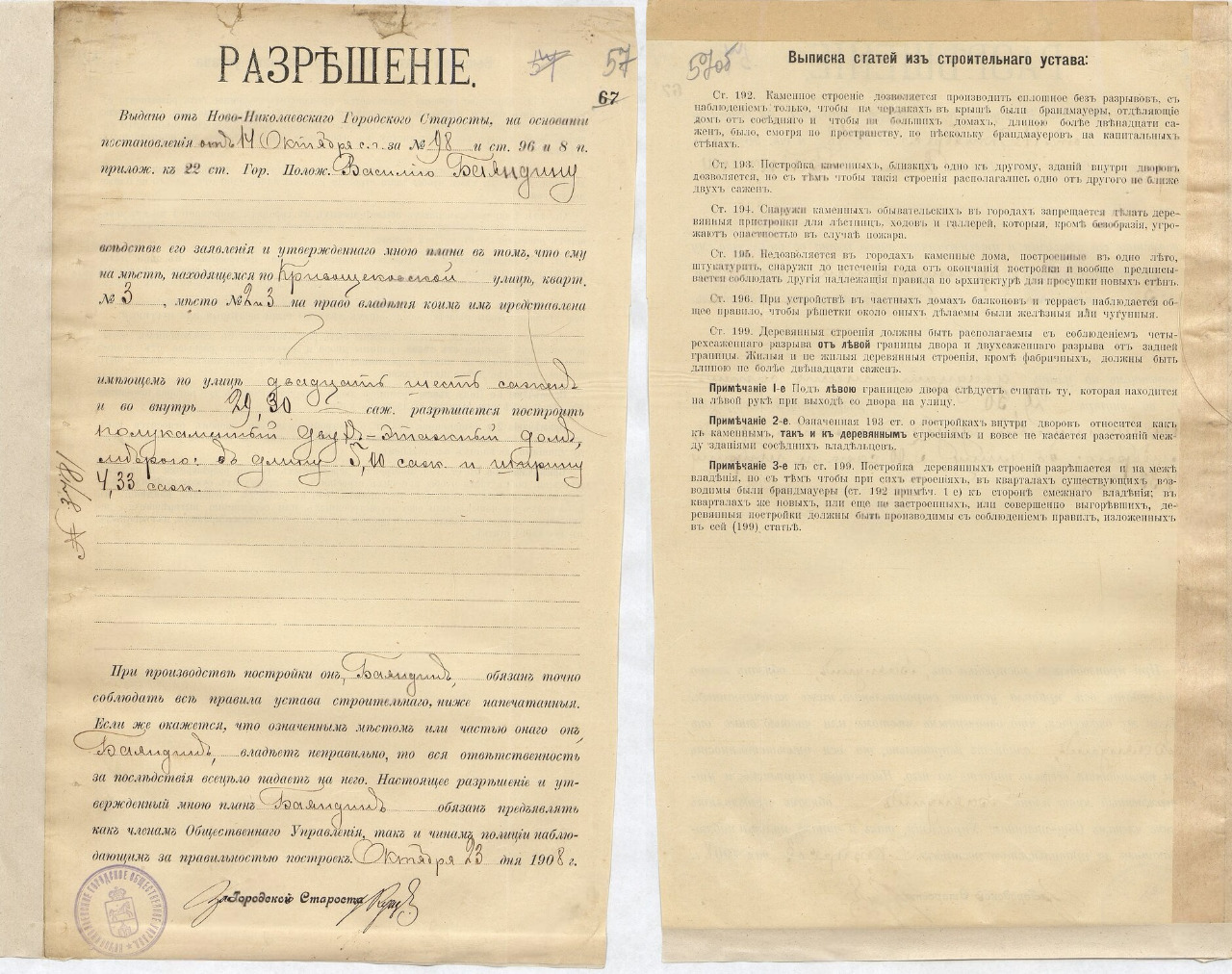 Вроде, этот дом стоит на 2-3 участке в имении некоего Василия Баяндина, получившего осенью 1908-го разрешение на строительство полукаменной двухэтажки.