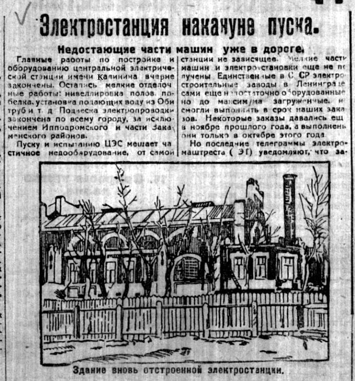 Пуск станции предполагался 7 ноября. Но станция еще до сих пор не пущена. Это объясняется задержкой выполнения оборудований, исполнявшихся главным образом на заводах Ленинграда, входящих в Эльмаштрест и Машинострой.