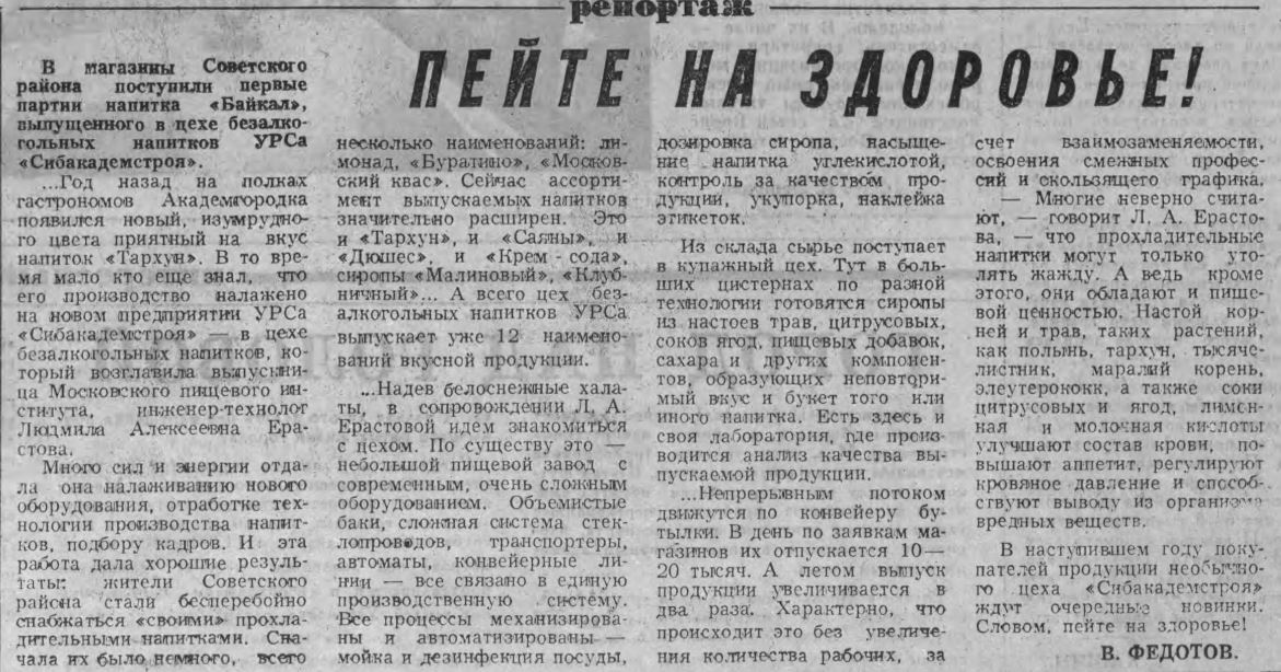 Цех безалкогольных напитков УРСа Сибакадемстроя открыли видимов 1985 году. Первыми были "Буратино", "Московский квас", "Тархун".