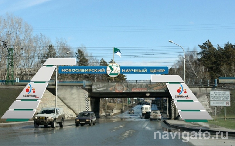 "В заключение Марк Василенко представил изюминку проекта – арочную конструкцию (на фото) на въезде в ННЦ со стороны Бердского шоссе, стилизованную под наклонные башни технопарка. Ее маркий белый цвет и флаг мэрии над сигмой, символом СО РАН, вызвали вопросы, особенно в связи с грядущим реформированием Академии наук."