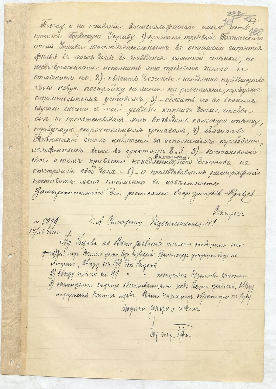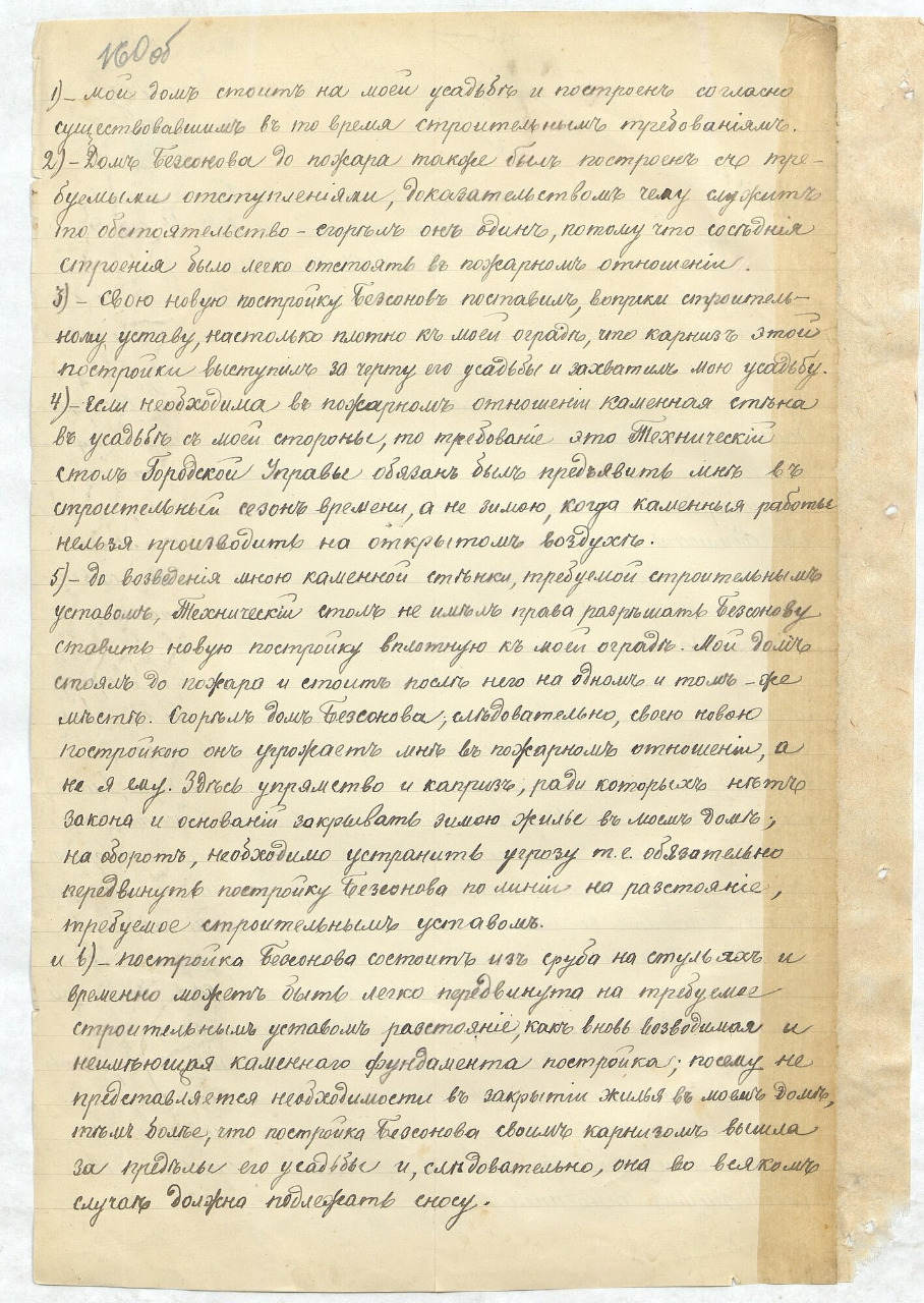 Т.е. Самохин всё же начал строить кирпичную стенку на границе с участком Безсонова, как и требовал Безсонов, и новый дом, который и сохранился ныне, и это, очевидно, так не понравилось Безсонову, что он и написал своё заявление в управу.