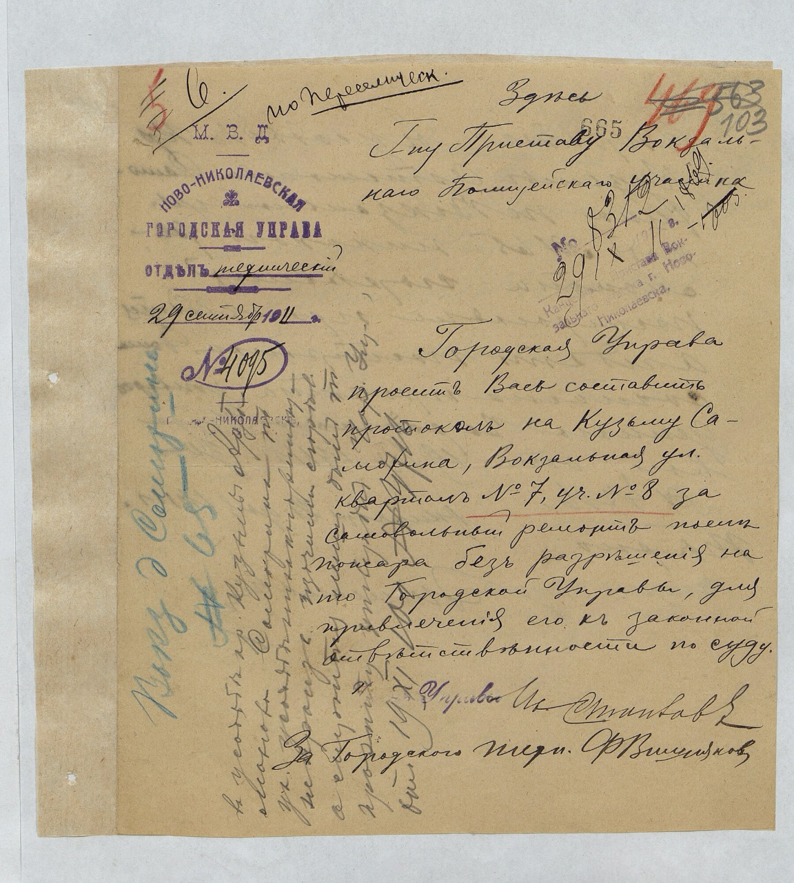 3) Пристав, после посещения Самохина, пишет, что никакого ремонта сгоревших построек Самохин не производит, а идёт постройка дома согласно утверждённого Управой проекта.