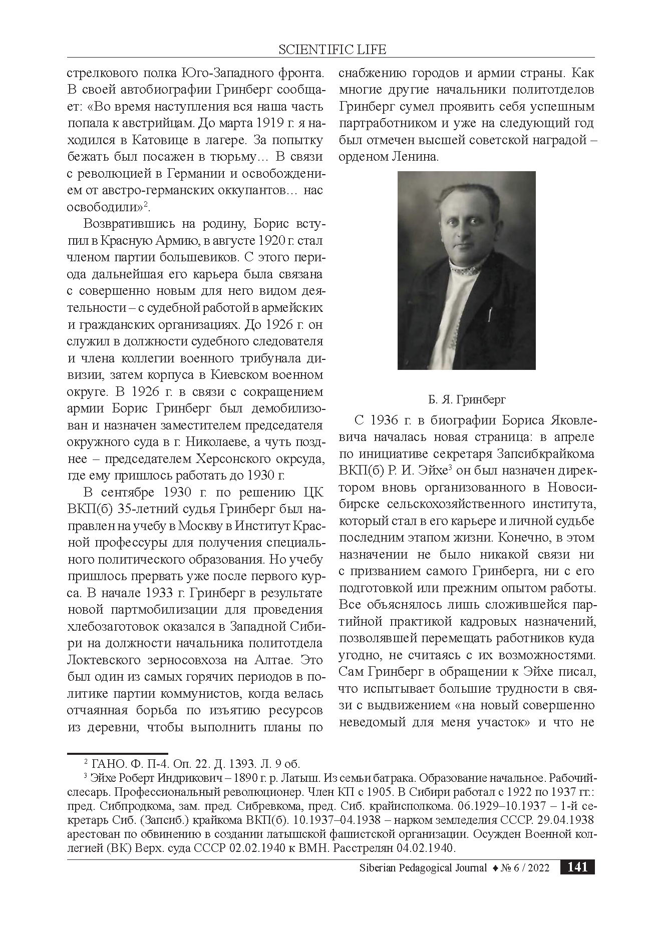 Между тем многие существенные аспекты этой истории остаются еще недостаточно изученными, целый ряд крупных научных деятелей незаслуженно забыт или известен лишь узкому кругу специалистов. В представленной публикации собран и обобщен материал о первом директоре Новосибирского сельскохозяйственного института Б. Я. Гринберге, занимавшем этот пост с 1936 по 1937 год.
