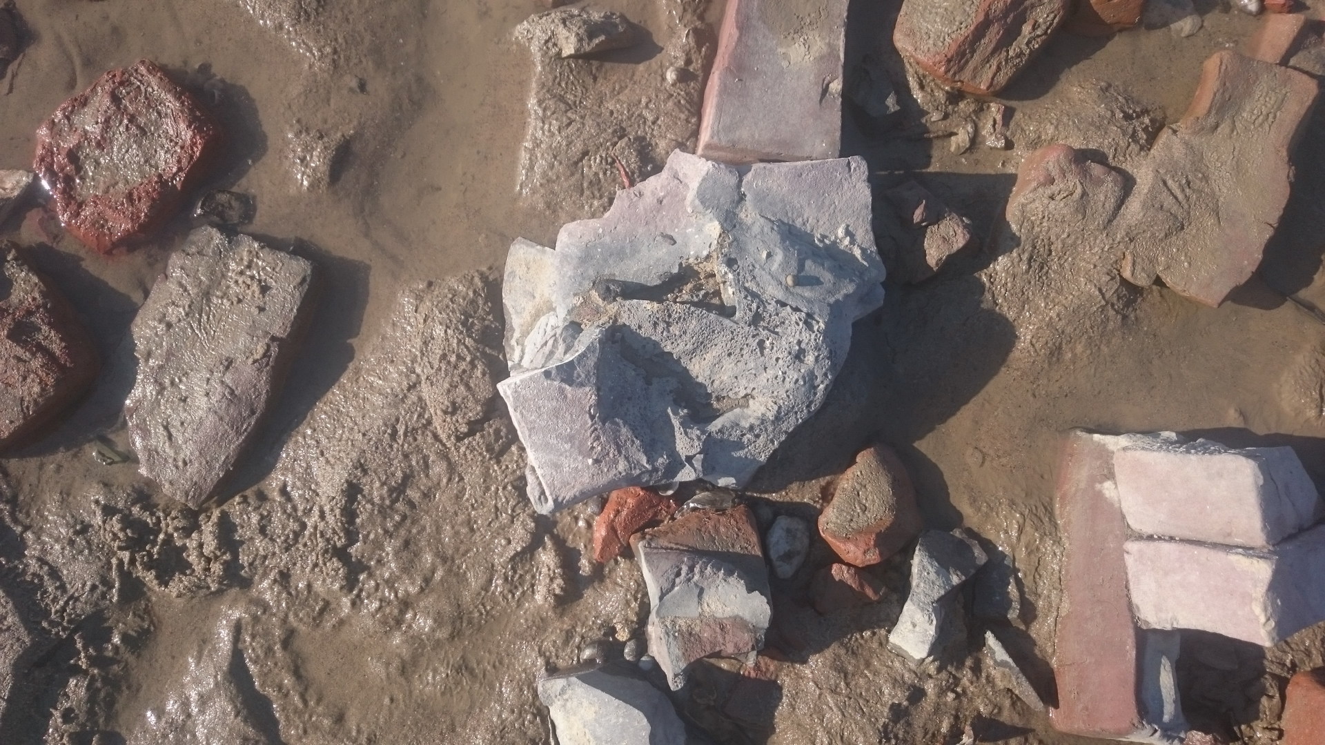очень много фрагментов кирпичеобразных предметов, выложенных аркой. Есть прямо-таки вскипевшие при плавлении.