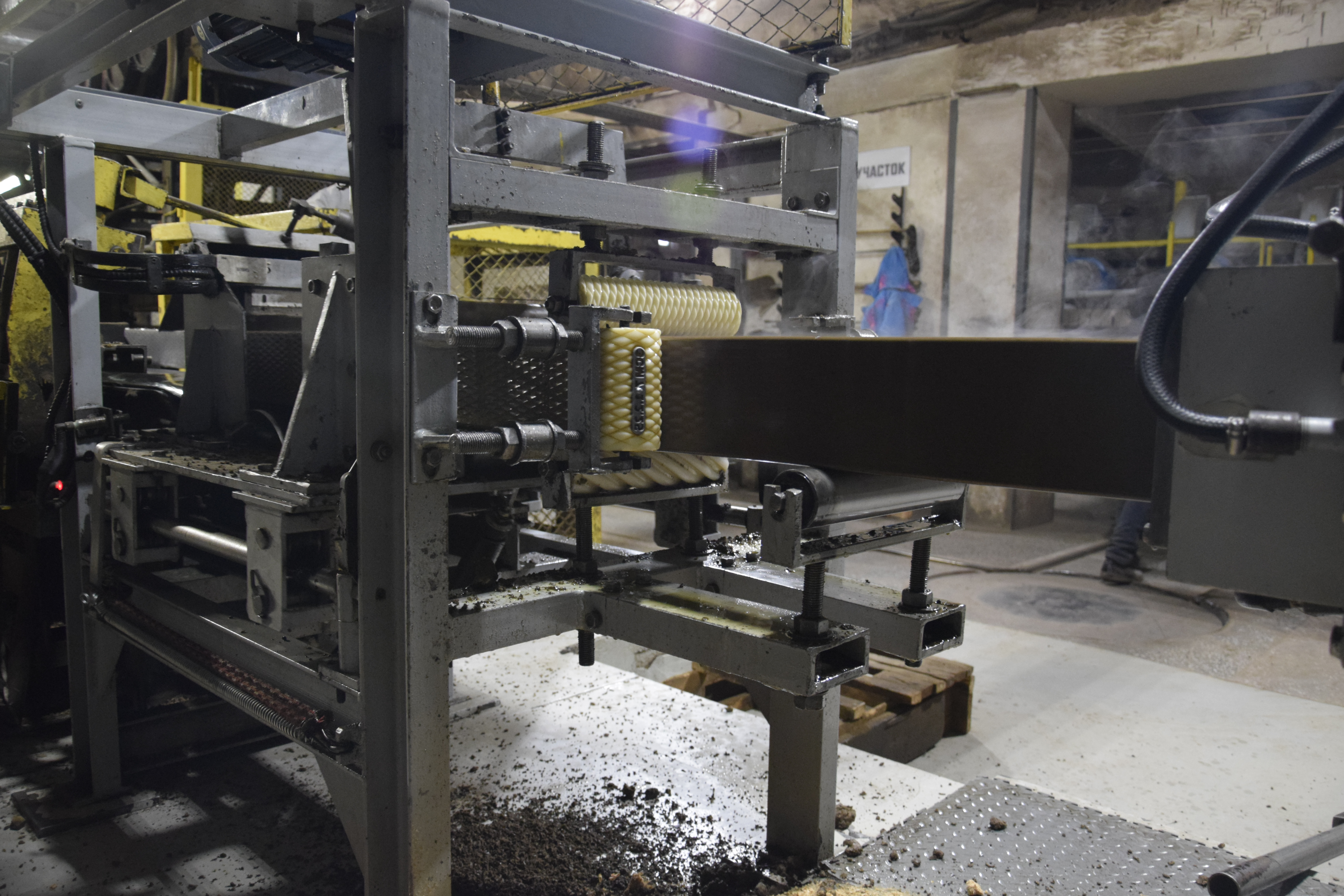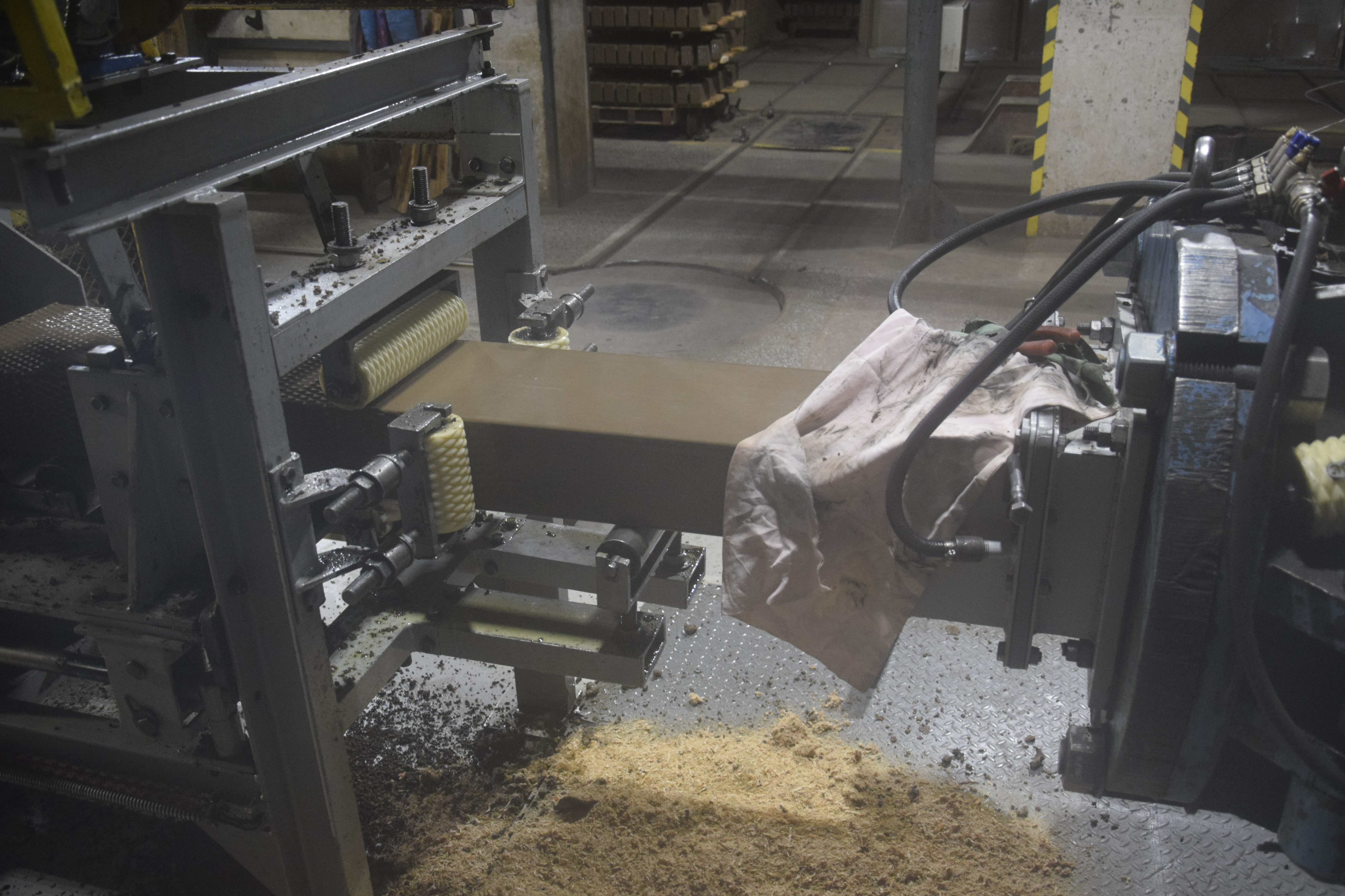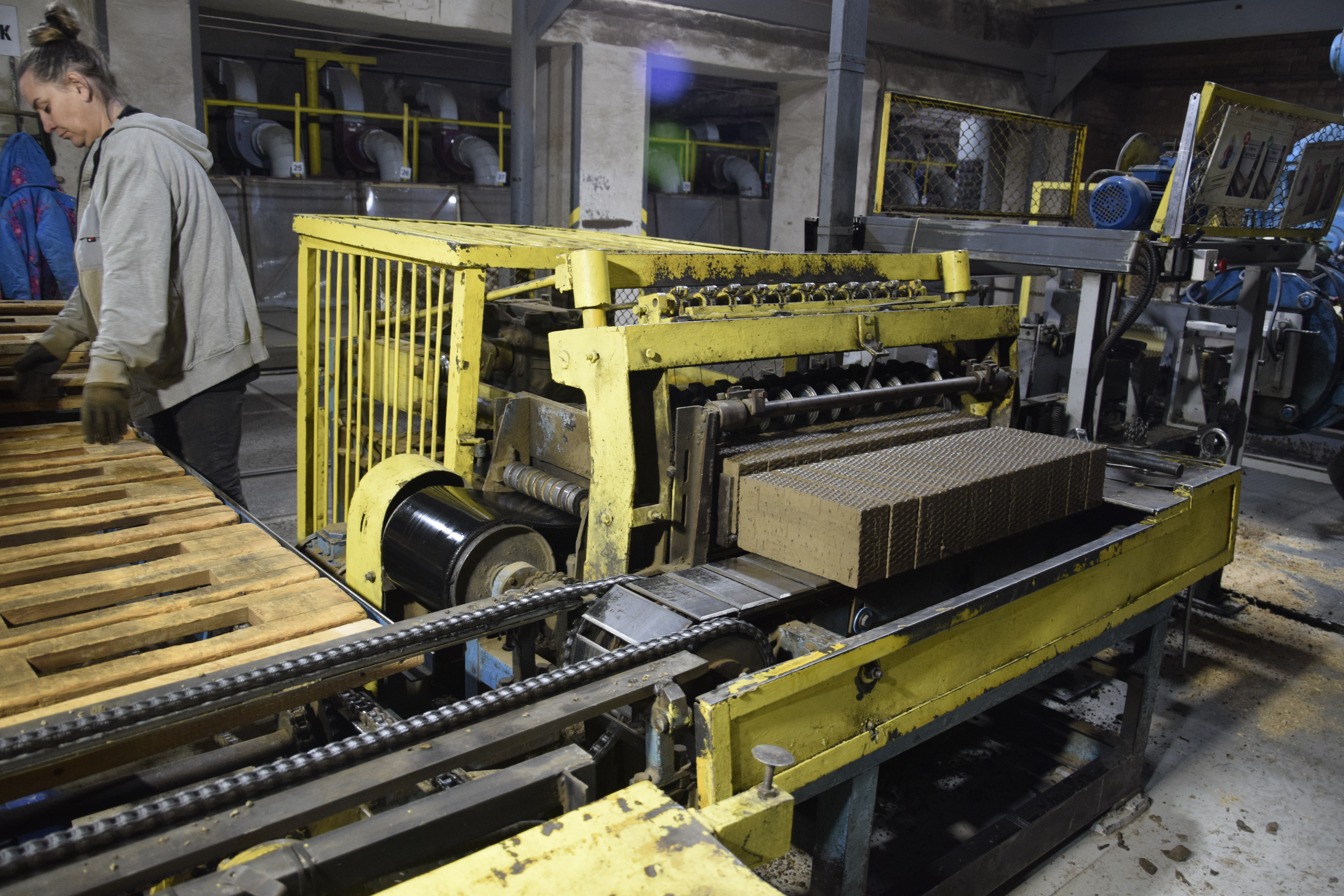 Непрерывный брус формованнной глины проходил через направляющие валики и нарезался струной на кирпичи.