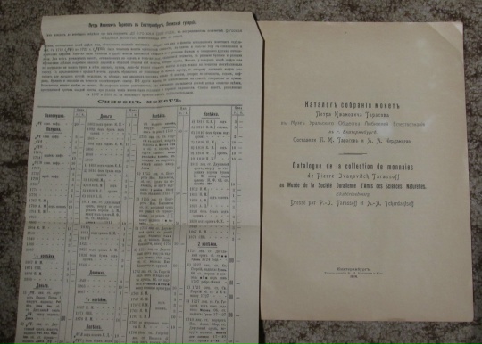 Перебирая старые книги, нашел брошюрку: Каталог собрания монет Петра Ивановича Тарасова в Музее Уральского Общества Любителей Естествознания в г. Екатеринбурге. Составили П.И. Тарасов и А.А. Черданцев. Екатеринбург: Тип. Е.Н. Ершова и К°, 1914. – [2], 81-113 = 35 с. 26,5×21,5 см.