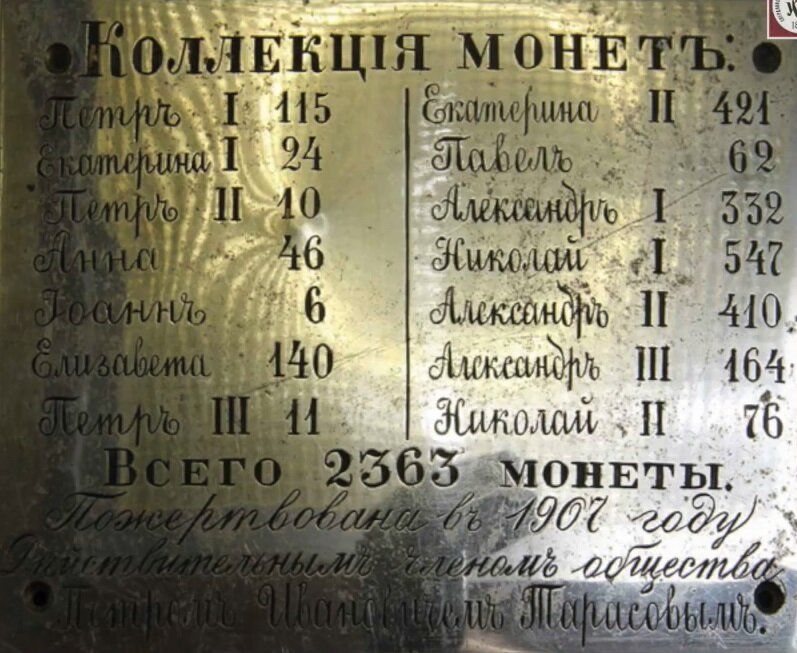 В 1907 году коллекция пополнилась богатым собранием русских монет 1700 -1900 годов, принадлежавшим золотопромышленнику П.И.Тарасову.