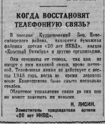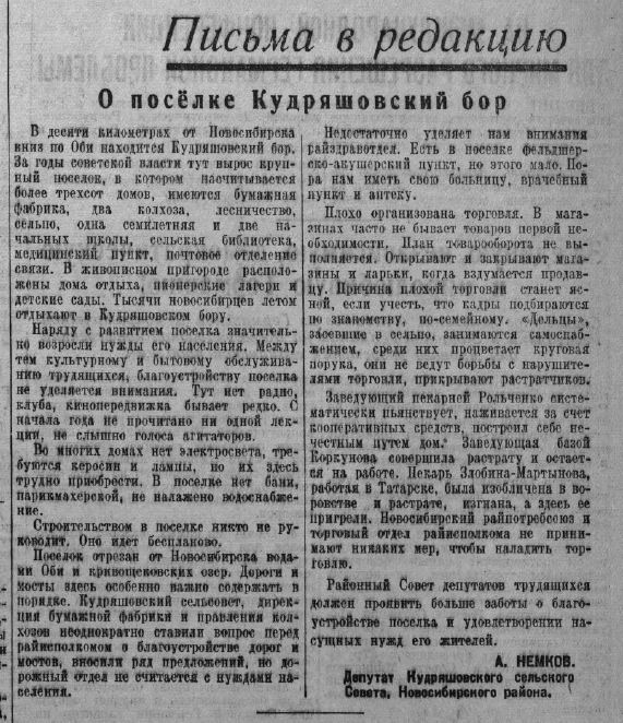 Нашёл в инторнетах, что в Кудряшовском посёлке в 30-м году решили возвести бумажную фабрику, сырьем для которой вроде как должны были использоваться водоросли реки Обь (что уже само по себе бред). Насколько понимаю, никто ничего толком не помнит и не знает. Скрее всего , информация сильно искажена и частично выдумана.
