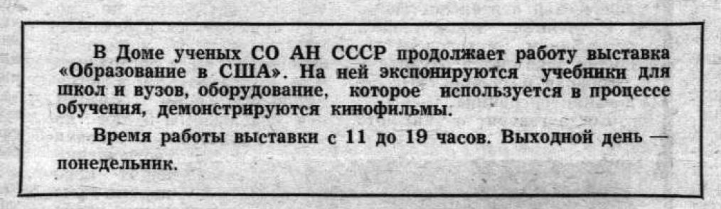 Возникает вопрос- почему не сохранилось фото этого павильона в Новосибирске, почему нет вообще фото с этой выставки в Зональном институте ? Да и фото в других городах этой выставки нет. Городские архивы ограничились тремя предложениями об этой выставке. Не выгодно было СССР сохранять в памяти людей как живет Америка ?