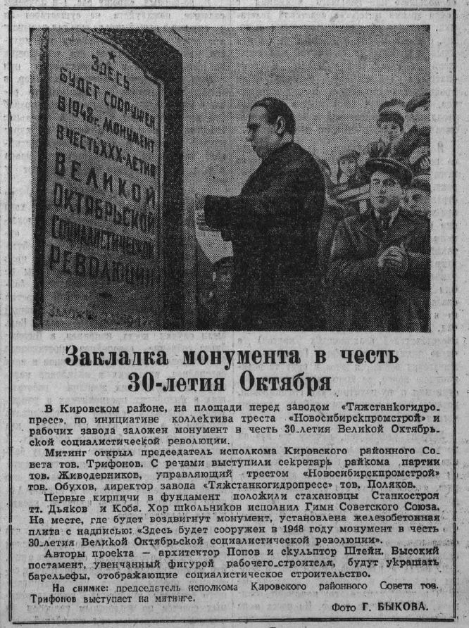 Фотография. Закладка камня под монумент, посвященный 30-летию Великой Октябрьской социалистической революции в городе Новосибирске.