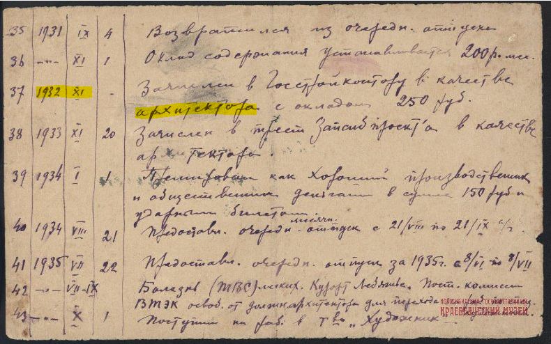 А вот трудовой список. Там снизу можно отдельно выбирать его листы для просмотра: Трудовой список П. Г. Якубовского с рождения (1891 г.) до 1935 г.